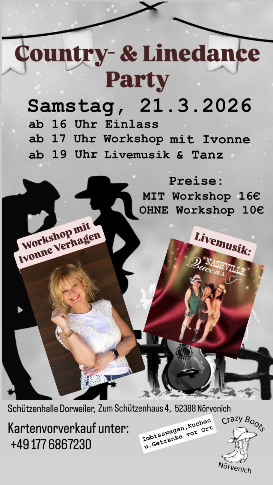Musikalisch werden wir von den Nashville Queens durch den Abend begleitet, die viele Linedance-Songs für euch spielen werden.